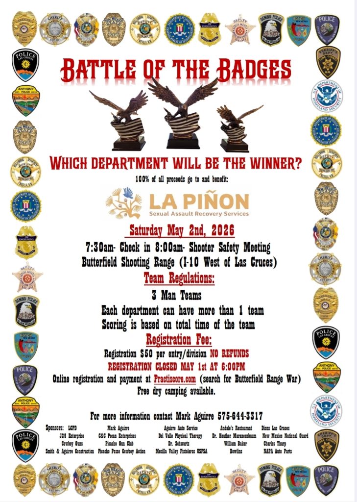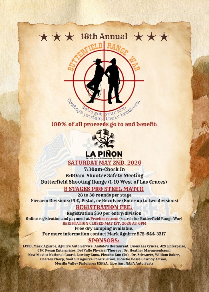 LCPD, Mark Aguirre, Aguirre Auto Service, Andale’s Restaurant, Dions Las Cruces, J29 Enterprise, C&C Pecan Enterprises, Del Valle Physical Therapy, Dr. Heather Marancenbaum, New Mexico National Guard, Cowboy Guns, Picacho Gun Club, Dr. Schwartz, William Baker, Charles Tharp, Smith & Aguirre Construction, Picacho Posse Cowboy Action, Mesilla Valley Pistoleros USPSA , Bowlins, NAPA Auto Parts